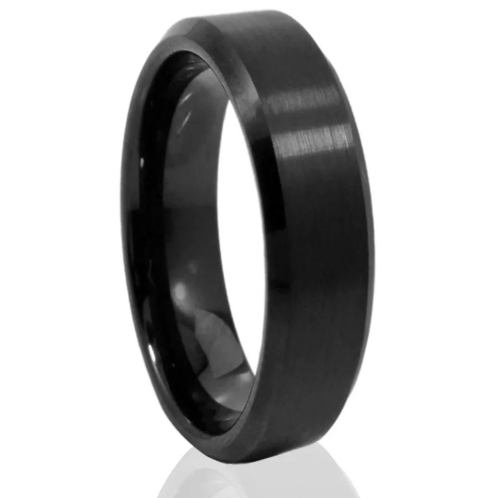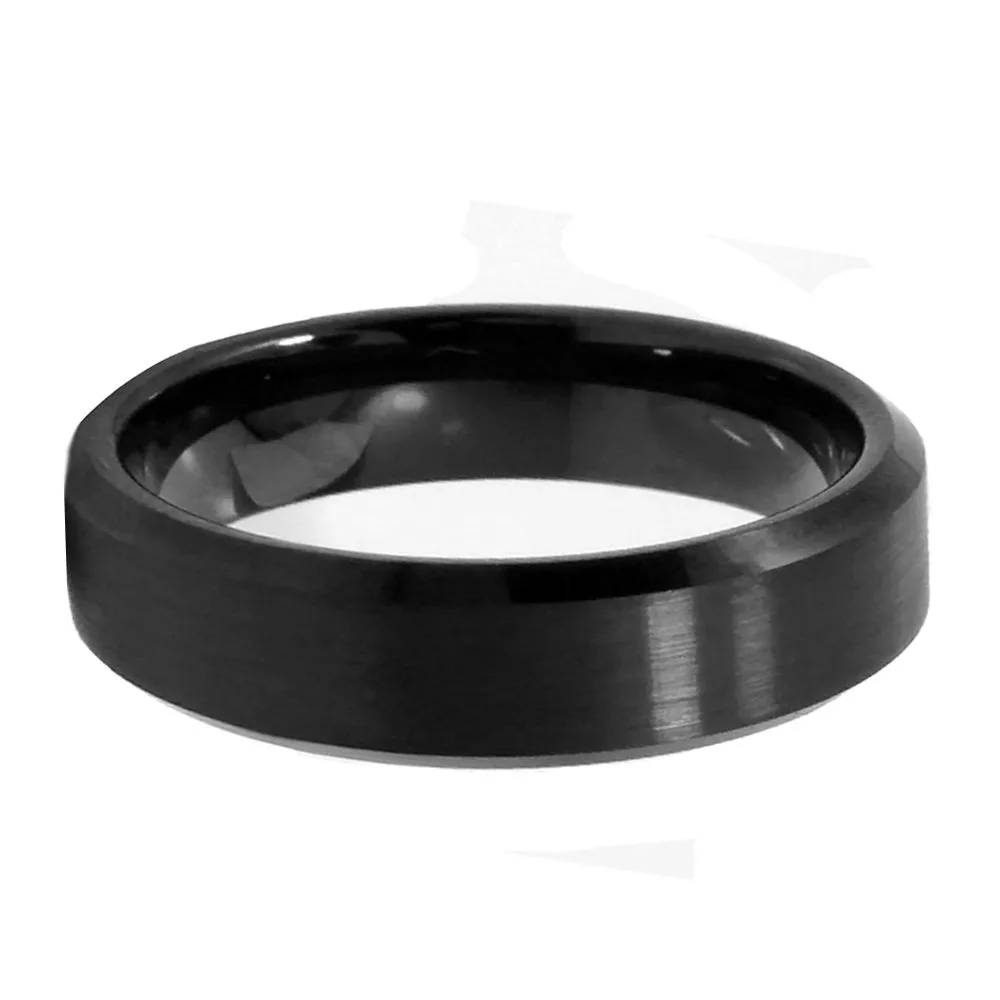 This black IP brushed tungsten wedding band features a brushed center and polished edges. The band is 6mm wide and features beveled edges that create a sleek, yet minimalistic appearance. A very attractive ring and perfect for any occasion.