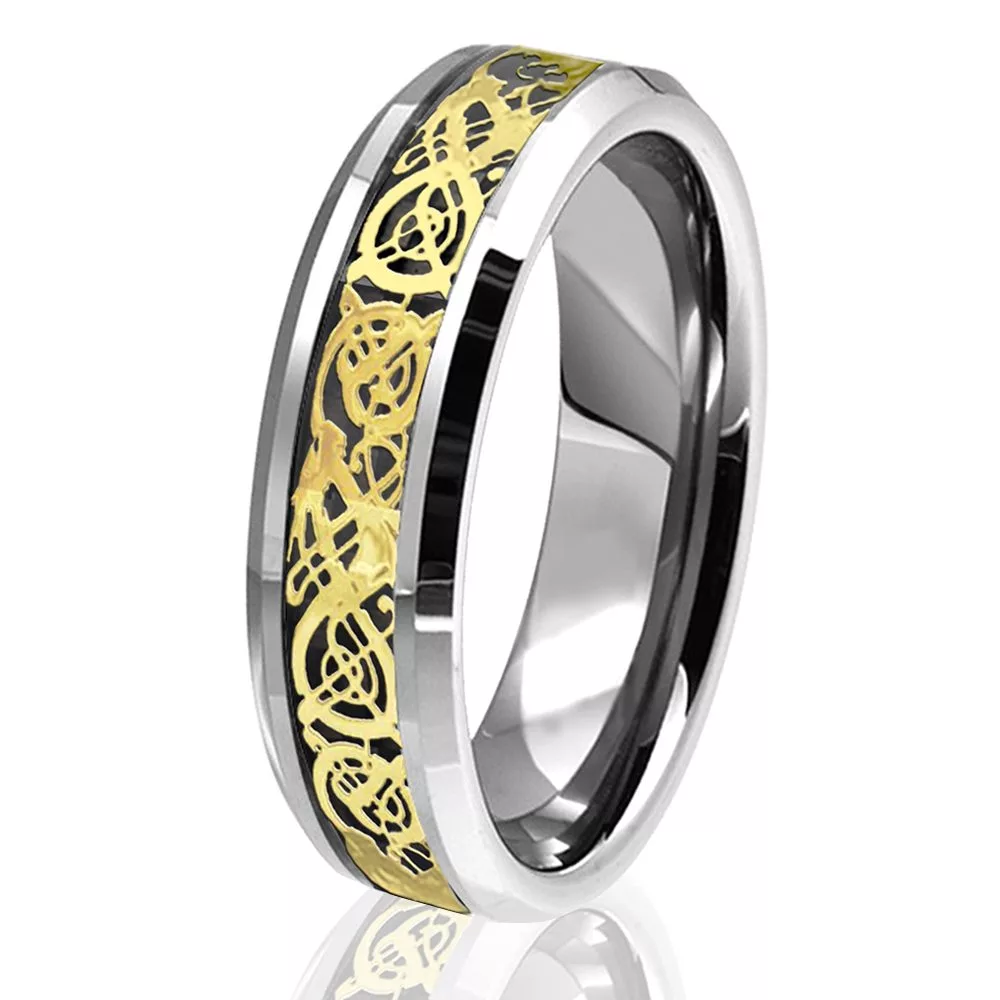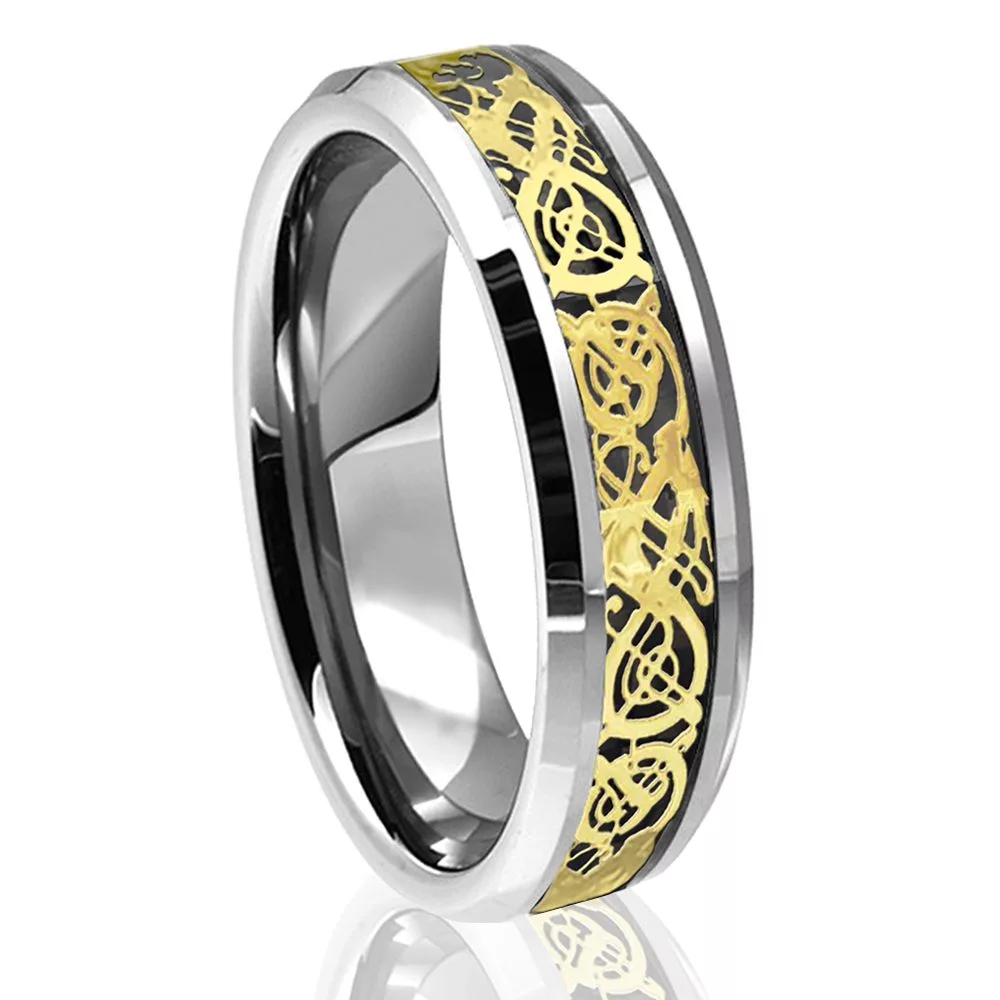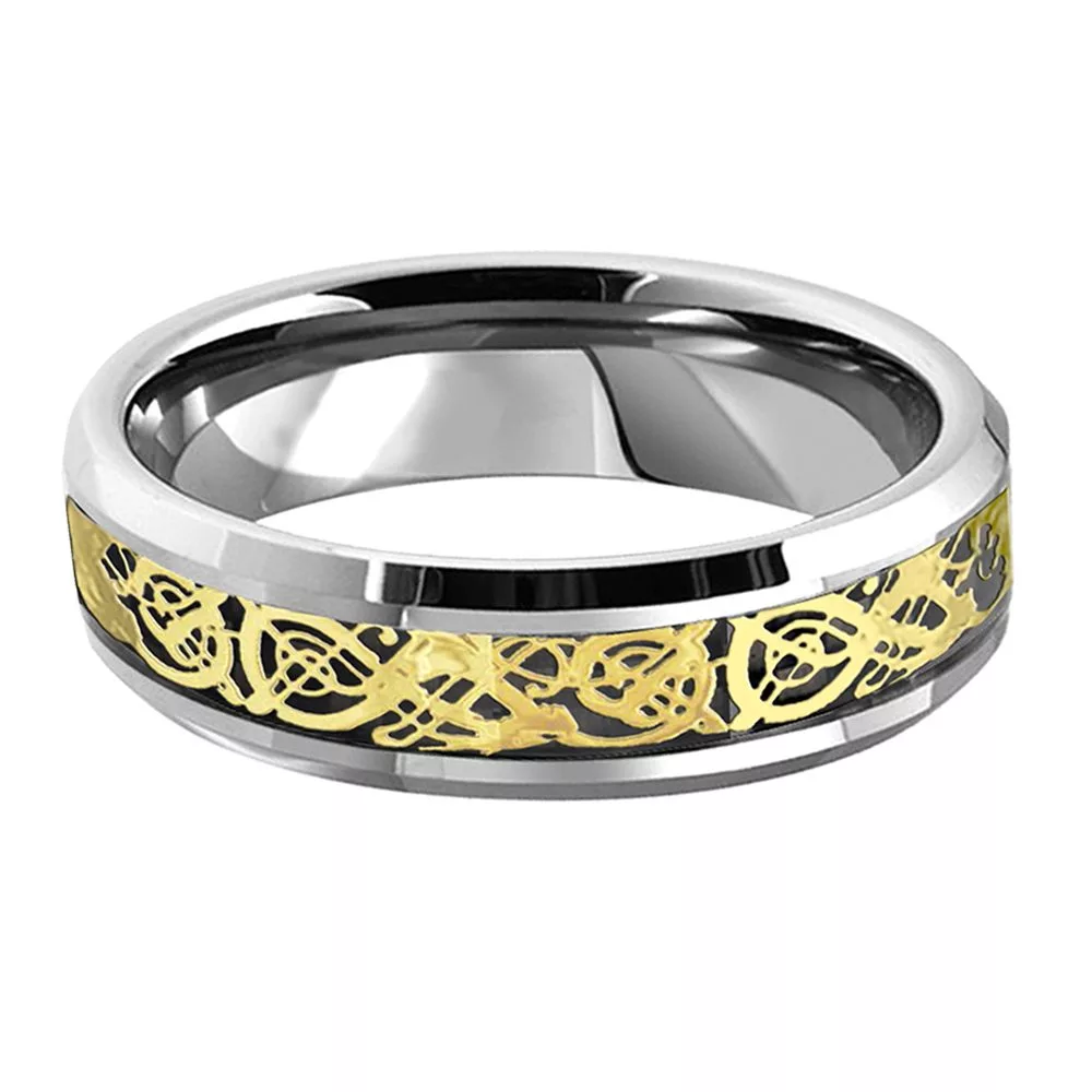 6mm Silver Tungsten Wedding Ring with Gold Celtic Dragon and Carbon Fiber Inlay Mens Womens Comfort Fit Band