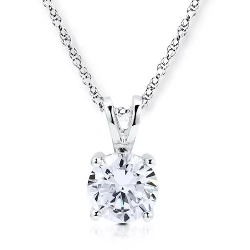 If you are looking for a simple, yet elegant and classic pendant that will not go out of style, this captivating necklace is the one. The pendant is set in a four prong setting and it has 0.84 carat round brilliant cut cubic zirconia stone. The diamond equivalent weight of this single stone is 0.43 carat. It comes with a matching chain and lobster clasp closure. Glowing with shine and brilliant luster, this pendant suspends from a chain length of your choice (select length from menu). Made from solid sterling silver and plated in tarnish resistant rhodium.