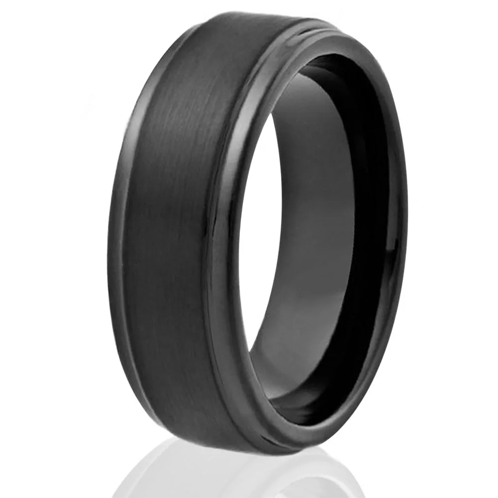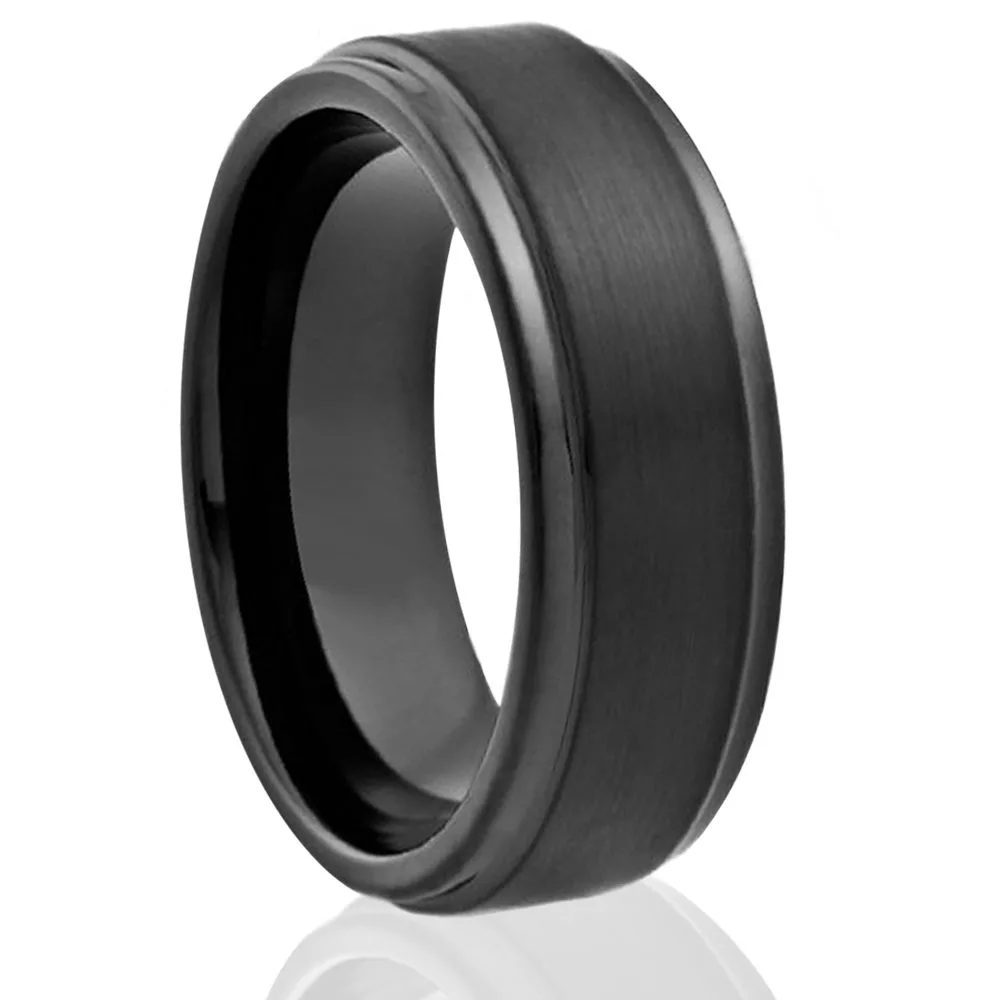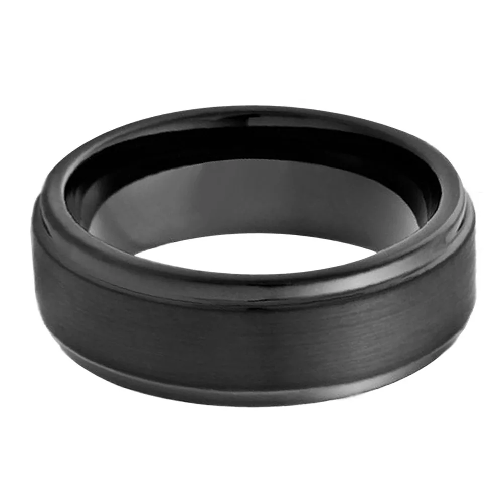 Simple, classic, and minimalistic. This black titanium wedding band has a brushed finish, giving it a subtle, yet attractive appearance. With step edges and a comfort fit interior, this mens 8mm black titanium band is as comfortable as it is stylish. Elegant and understated, this ring is a great addition to any jewelry collection.