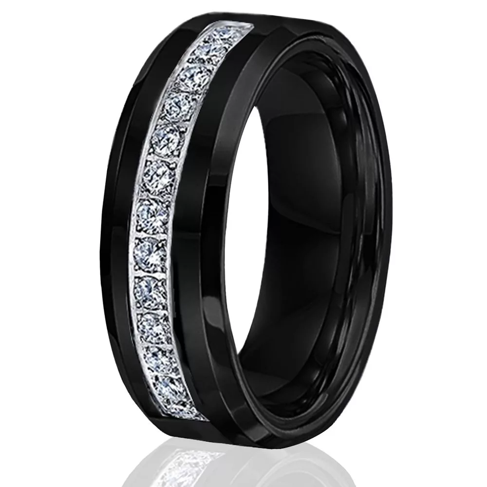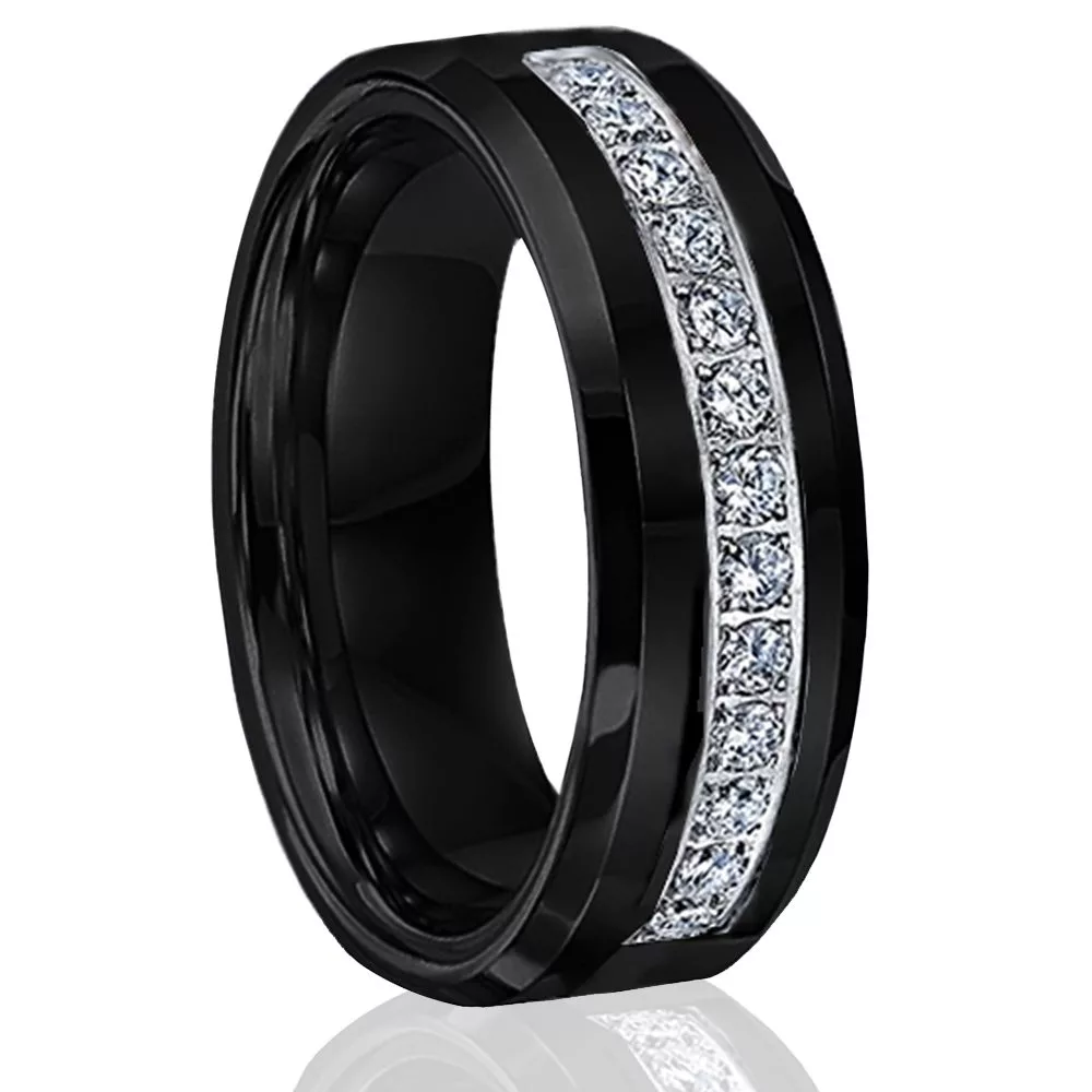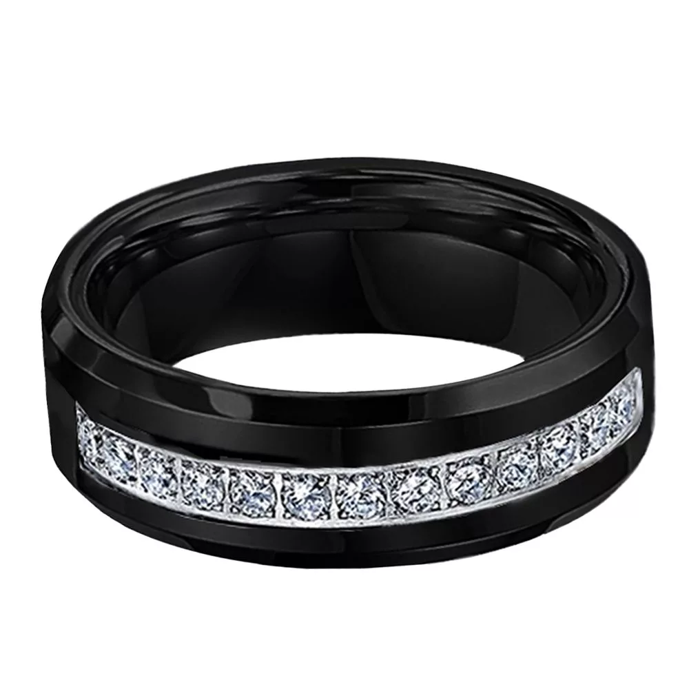 With its sleek, modern style and sophisticated black finish, this tungsten wedding band fits the fashion needs of todays man. The center of the ring features 13 simulated diamonds that are surrounded by a smooth black finish. The contrast of the silver and black beautifully showcases the single row of stones. A perfect choice for the gentleman looking for a classy ring with a hint of luxury.