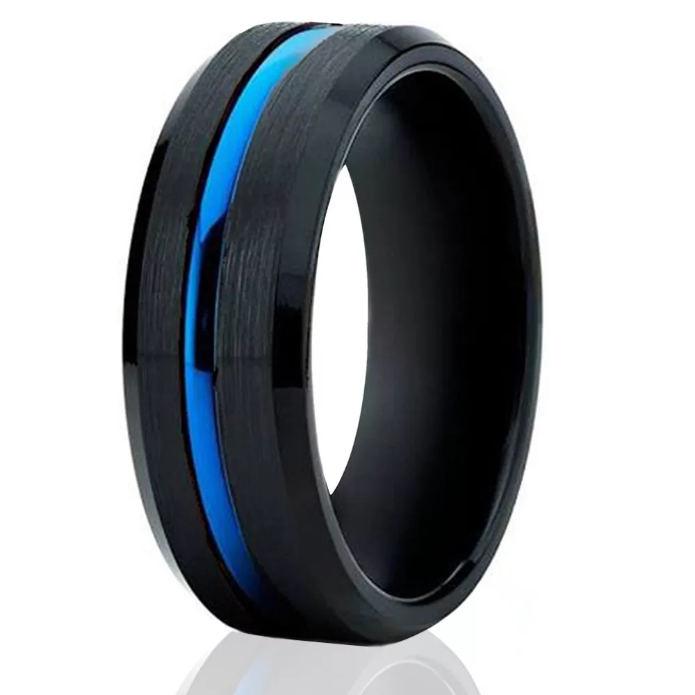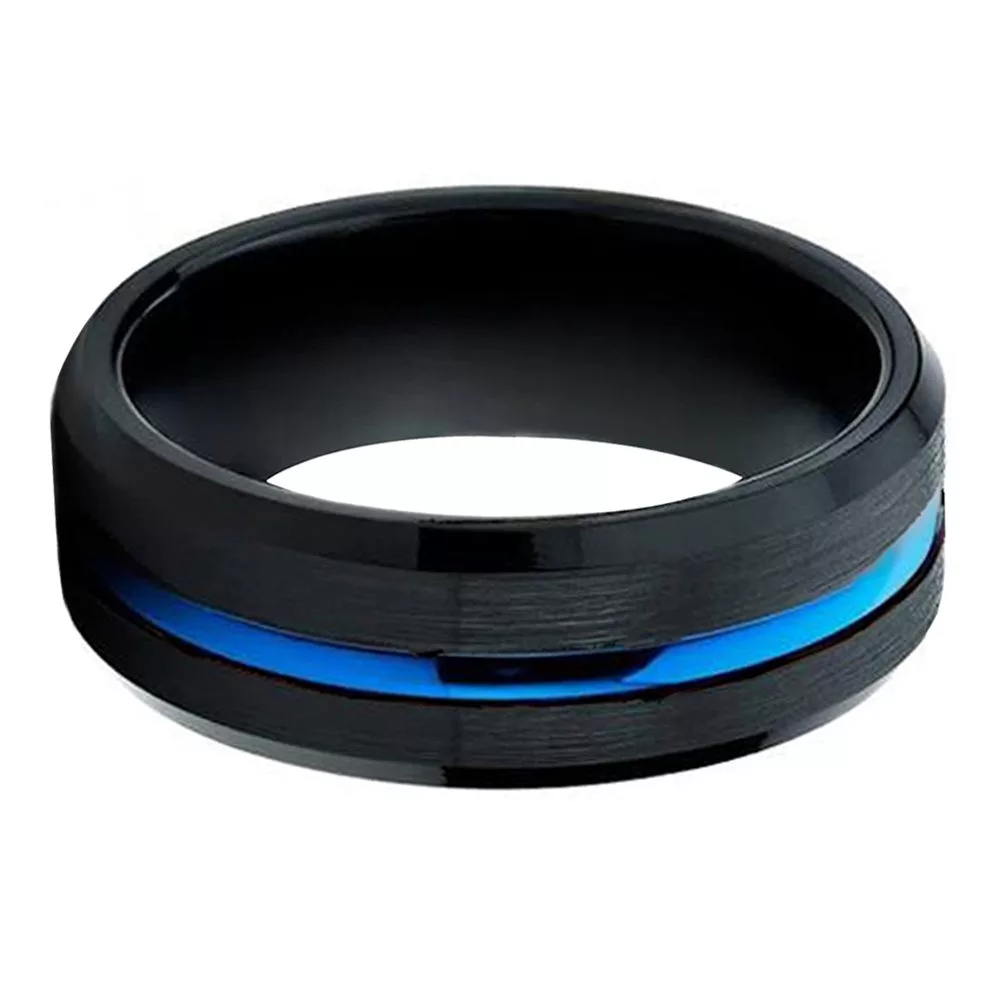 The ultimate in contemporary style, this black tungsten wedding band with blue polished stripe center is a sleek and contemporary alternative to traditional gold or silver wedding band. A brushed finish on the outside gives it a balanced look and keeps it from appearing too flashy. On the inside, the ring is polished for comfortable fit and feel. The recessed blue stripe center adds just a dash of flare and style to this attractive ring. An excellent choice for men who want an alternative to traditional wedding bands.