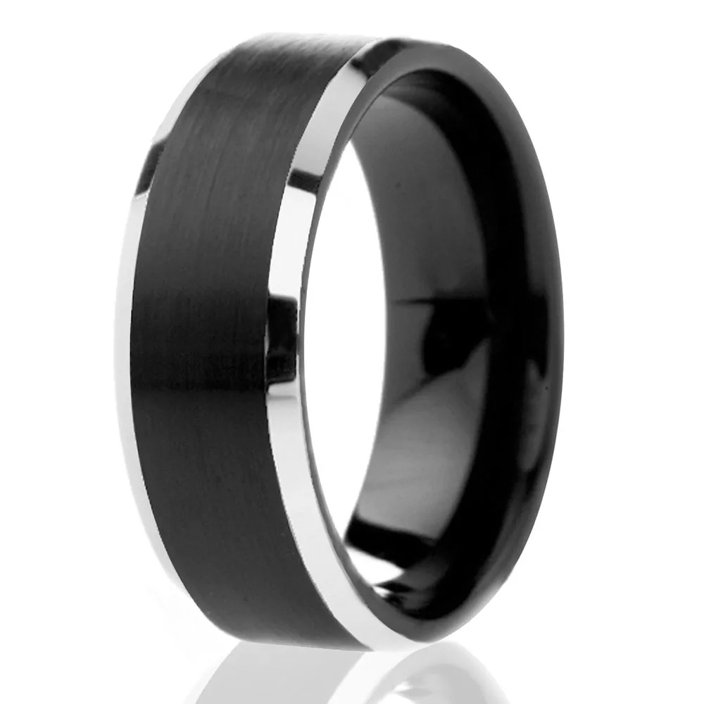A truly modern take on a classic wedding band. A beautiful mens tungsten ring with electroplated black brushed center offset by silver polished edges. The polished beveled edges contrast the brushed center giving it an edgy, yet sophisticated look. Perfect for the groom or young adult looking for something traditional, yet, modern and fashion forward.