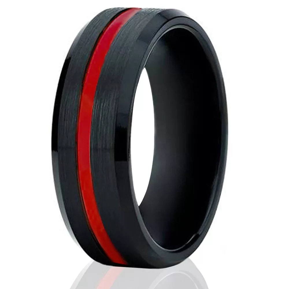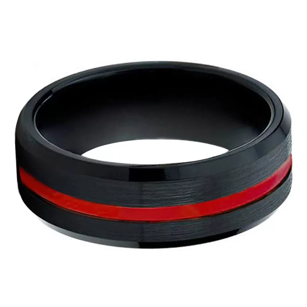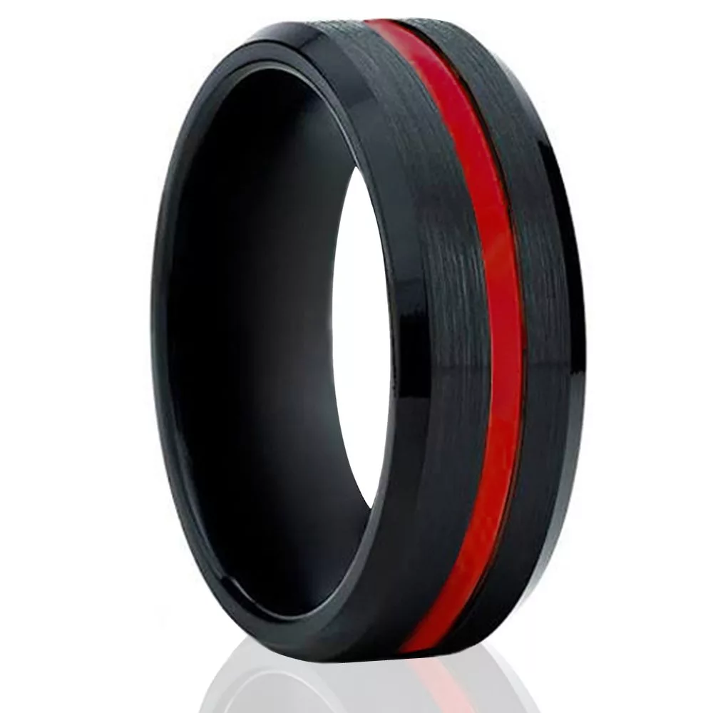 The black tungsten wedding band with red stripe center is a sleek and contemporary alternative to traditional gold or silver wedding band. A brushed finish on the outside gives it a balanced look and keeps it from appearing too flashy. On the inside, the ring is polished for comfortable fit and feel. The recessed red stripe center adds just a dash of flare to a classic band.