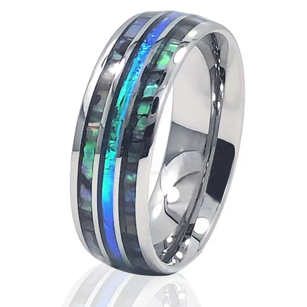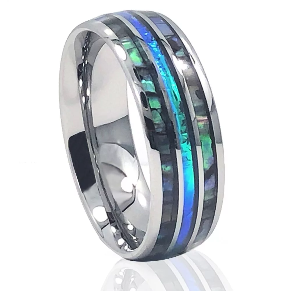 Traditional wedding bands are all the same. Plain, flat and boring. You were looking for something with a little more panache, an element of intrigue; something that could be worn during special occasions or casual nights out with friends. You’ve found it – the Meravi men’s 8mm tungsten wedding band with abalone inlay is the perfect upgrade to your style.