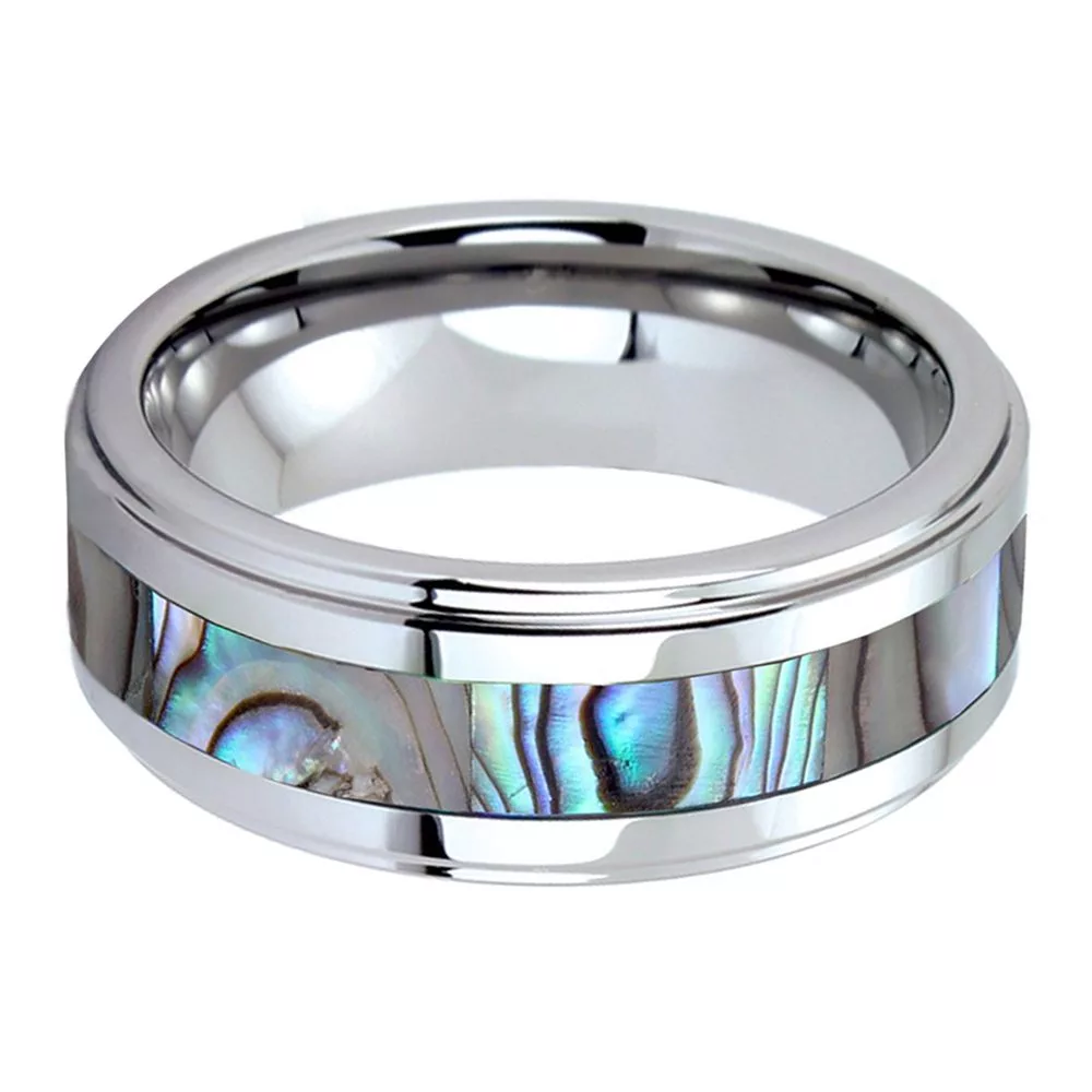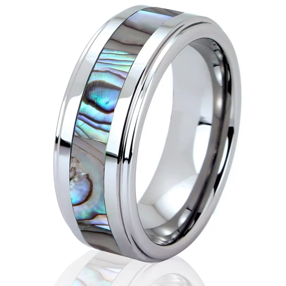 The Meravi tungsten and genuine abalone ring is truly a one-of-a-kind ring. The abalone shell is skillfully inlaid into the tungsten ring, creating a stunning chromatic effect. Due to the uniqueness and nature of abalone, each ring has its own unique pattern and no two rings are alike. The 8mm tungsten band also features an attractive step edge design, making this ring a true work of ark. Thanks to the durability and low maintenance of tungsten, you’ll find yourself wearing this ring every day – whether it’s for work or play.